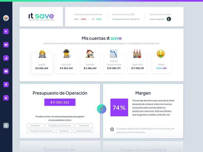 Seguido de eso, cada vez que los usuarios ingresen a la plataforma verán un dashboard en el que se les mostrará información sobre los ingresos semanales, presupuesto y sugerencias sobre qué cosa, por ejemplo, comprar; un resumen sobre los saldos de cada centro de costos y una clasificación hecha automáticamente por la IA sobre los movimientos bancarios.