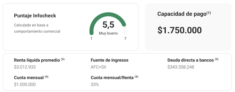 La plataforma ofrece tres tipos de informe, que van desde los $5.900 y los $14.900. Este último es el más completo y da cuenta de los ingresos, la deuda bancaria y la capacidad de pago del solicitante. Esa información sale desde distintas fuentes, como el Servicio de Impuestos Internos, la Administradora de Fondos de Cesantía y la integración directa que tienen con el Boletín Comercial de la Cámara de Comercio de Santiago.