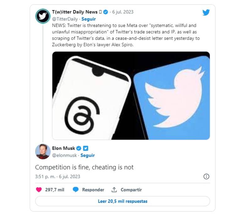 Fuentes al interior de Meta desmintieron las insinuaciones en la carta, pero oficialmente no se han manifestado, mientras que Twitter amenaza con su demanda. Elon Musk respondió un tuit, diciendo “Competir está bien, pero copiar no”.