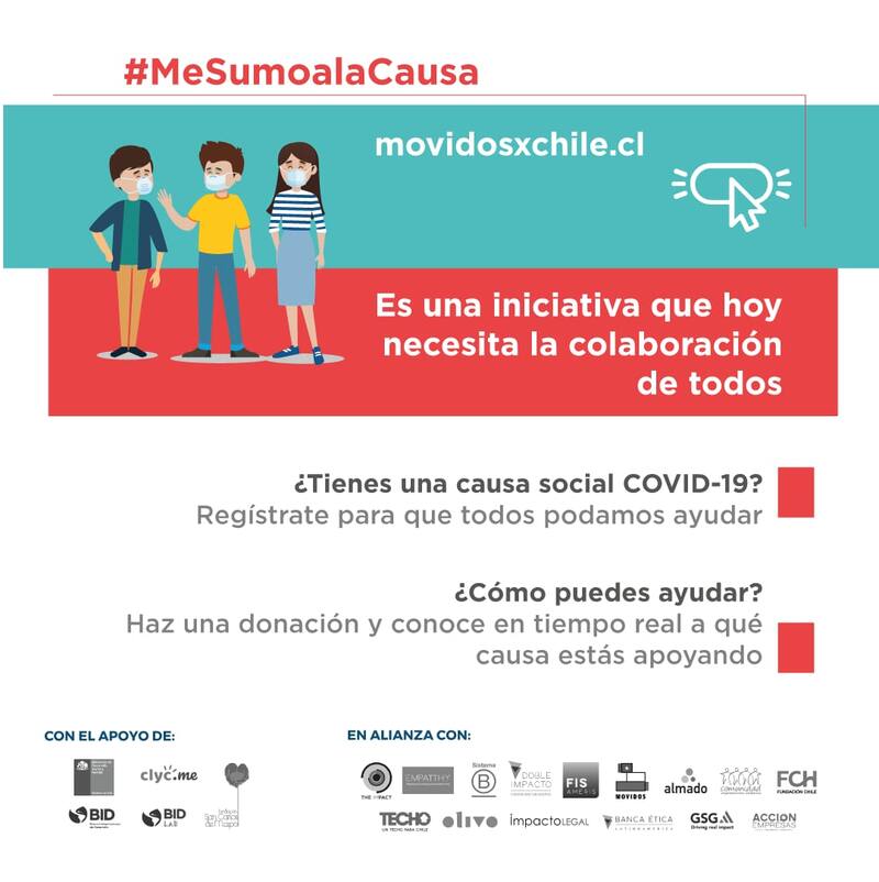 El sitio movidosxchile.cl está desarrollado por empresas y fundaciones locales, articulados por el Ministerio de Desarrollo Social y el Banco Interamericano de Desarrollo, con la idea de armar puentes entre las organizaciones que necesitan ayuda y quiénes la pueden entregar, sean empresas, entidades de distinto tipo o personas. La campaña se presentará bajo el lema #MeSumoalaCausa.