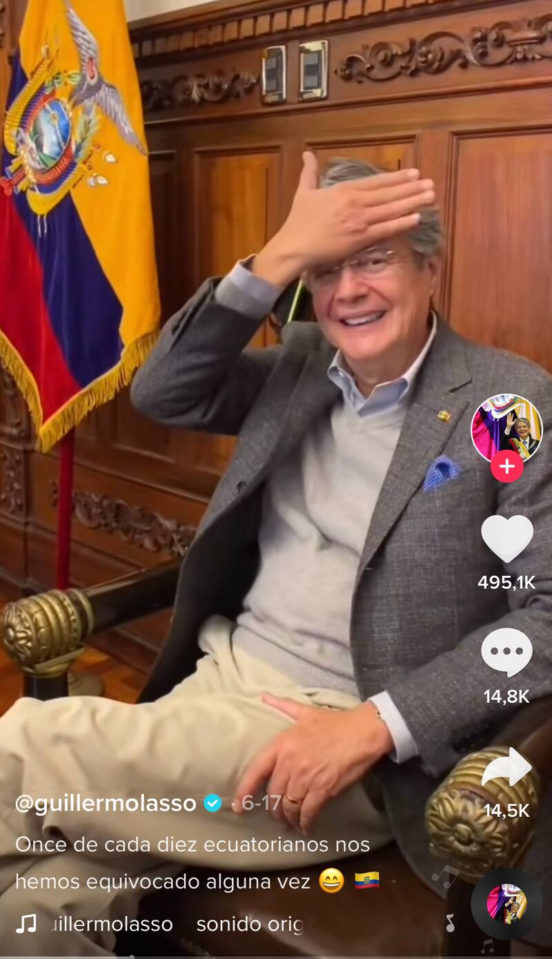 Ese gesto mínimo, acompañado de una amplia sonrisa, registró 2.5 millones de visitas en apenas un día, y reportó 112.000 seguidores nuevos. Sin embargo, en Twitter no dejaron pasar que en el inicio de la contienda presidencial Lasso había desechado crear una cuenta en TikTok, argumentando que era una herramienta ajena a su rango etario de 65 años, al momento de la campaña.