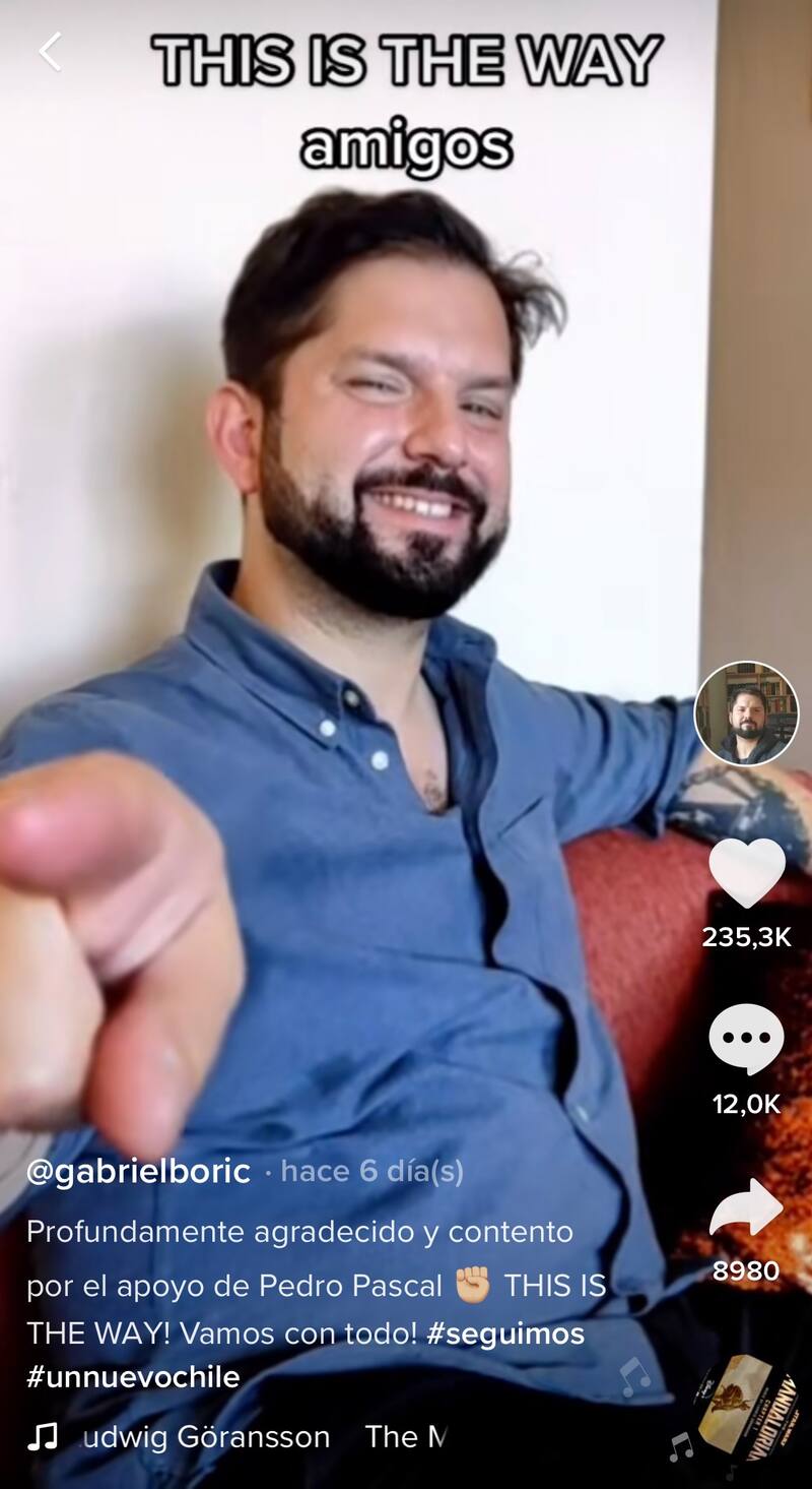 El candidato Gabriel Boric tiene 141 mil seguidores en su cuenta de TikTok y, en esta segunda vuelta presidencial, lo ha ocupado más. Por ejemplo, el que realizó para destacar que el actor Pedro Pascal hizo un llamado a votar por él, tuvo 235 mil likes. Dos voceros de su comando también abrieron cuentas pero hace poco las revitalizaron para respaldar la campaña: Camila Vallejo y Giorgio Jackson.