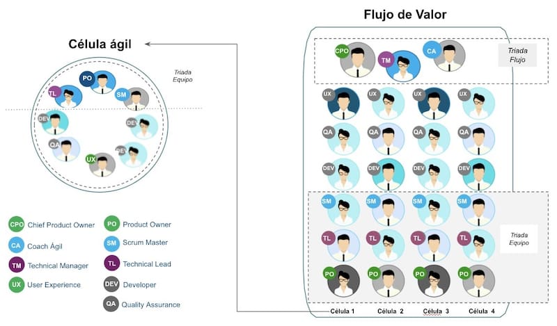 Al menos al interior de la institución financiera, lo que han hecho es que, después de haber tenido las células en un comienzo dispersas en distintos lugares, decidieron organizarlas. Fabricaron así varios grupos denominados “Flujos de valor” que son, básicamente, varias células y que representan una necesidad de un cliente, sea por segmento, producto y canal. En el caso del Flujo Valor Pyme, por ejemplo, este reporta al Área de Estrategia y de Negocios Pyme con el trabajo que han realizado. Hoy día cuentan con al menos 15 flujos, con unas 150 personas cada uno.