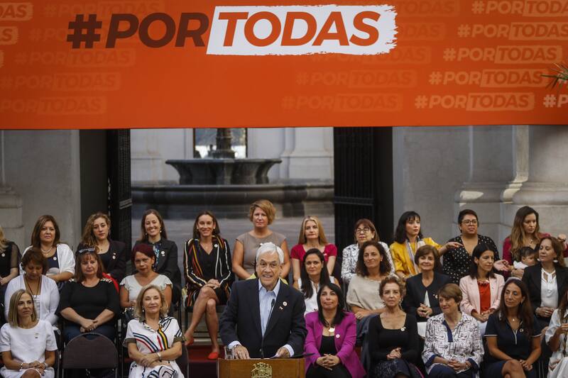 En la conmemoración del Día Internacional de la Mujer en La Moneda, el mandatario anunció nuevos proyectos de ley: uno de monitoreo telemático para proteger a mujeres víctimas de violencia intrafamiliar y la incorporación de los deudores de pensiones de alimentos al boletín comercial. Además se anunció urgencia legislativa para dos iniciativas: la eliminación de discriminación en la administración de la sociedad conyugal y el que elimina la espera de 270 días para volver a casarse.