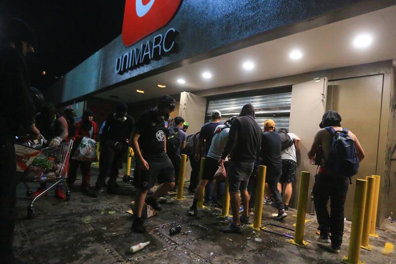 En el centro de Santiago, un local comercial Doggis -cercano a Santa Lucía-, un supermercado Unimarc de Av. Portugal y el OK Market ubicado en plena explanada de Baquedano, colindante al Teatro de la Universidad de Chile, fueron saqueados durante esa jornada. Horas más tarde, una farmacia Cruz Verde en la esquina de Lira con Diagonal Paraguay fue vandalizada.