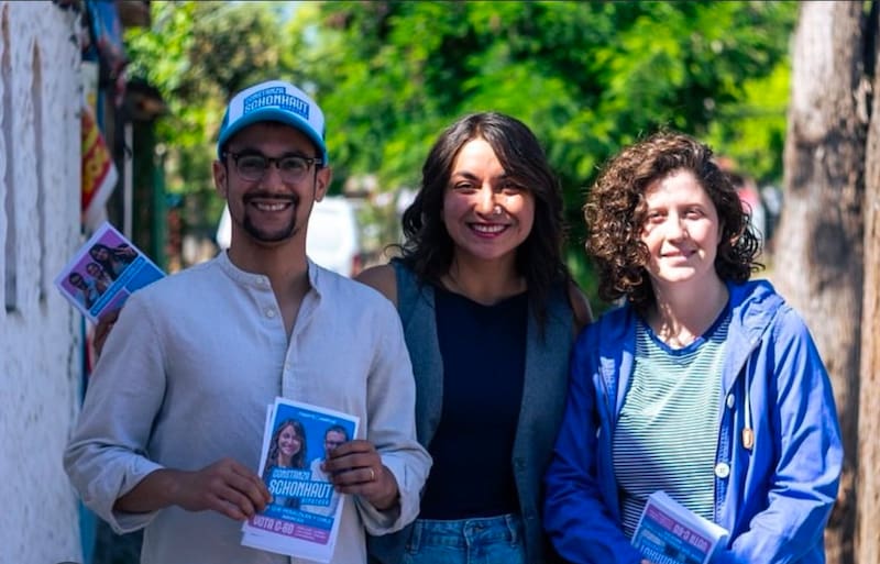 El alcalde Concha ha sido visto junto a la exconvencional en actividades de campaña y entregando volantes con su rostro. “Tome, le dejo a mi diputada: Constanza Schönhaut. Mi candidata, por si acaso”, dice el jefe comunal cuando entrega el material a los vecinos de Peñalolén.