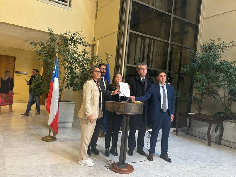 En un punto de prensa realizado en el Congreso, la jefa de la bancada, Joanna Pérez, junto a sus pares Erika Olivera, Miguel Ángel Calisto, el exPDG Rubén Oyarzo y el diputado Andrés Jouannet (Amarillos), dieron aviso de la interpelación contra el secretario de Estado.