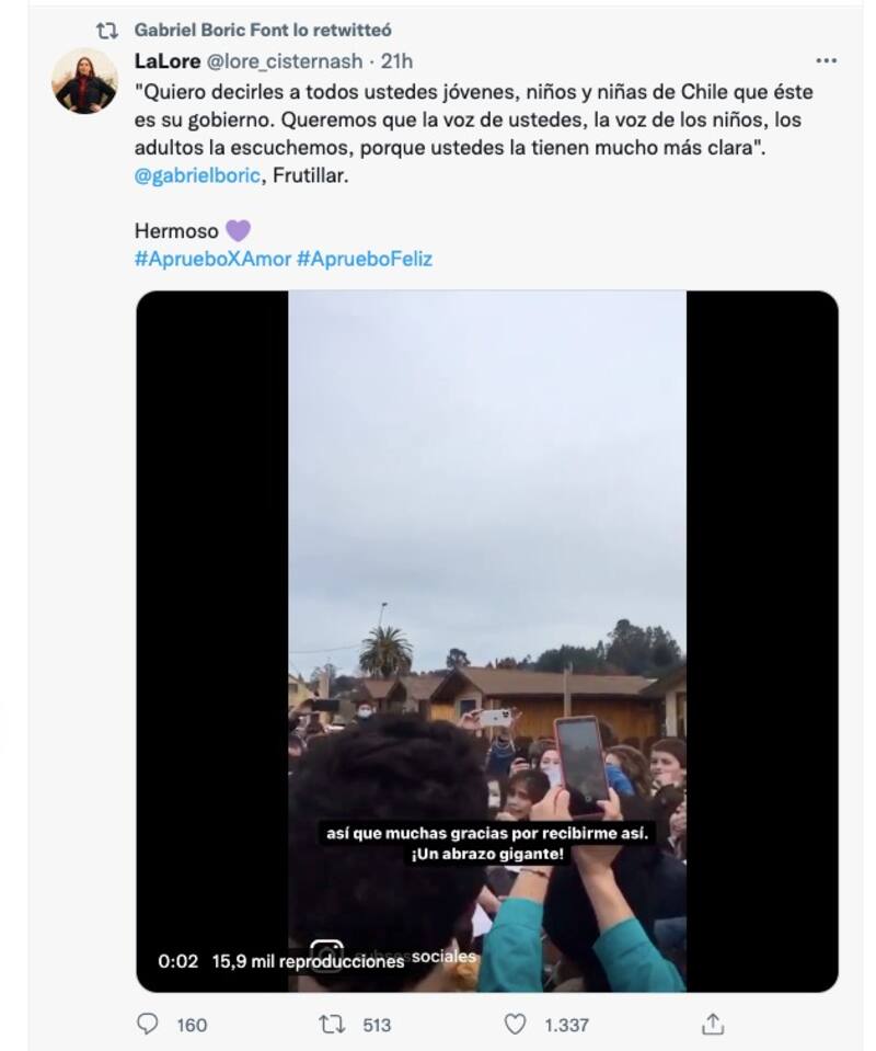 Cerca de las 16:00 de la tarde de este miércoles, desde la cuenta oficial del Presidente Gabriel Boric se realizó un retweet a una publicación que contiene el hashtag “AprueboXAmor” y “Apruebo Feliz”.