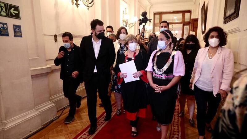 Antes de exponer en la comisión de Sistema Político, Bachelet -junto a Paulina Vodanovic, directora de su fundación, Horizonte Ciudadano-, había tenido un breve encuentro en uno de los salones del exCongreso con Loncon, Bassa, Catrileo y Montero.