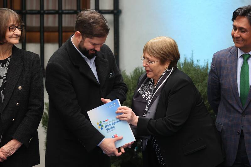 La expresidenta Michelle Bachelet fue parte de la ceremonia de entrega del Plan de Acción de Hidrógeno Verde que se llevó a cabo este jueves en el Palacio de La Moneda.