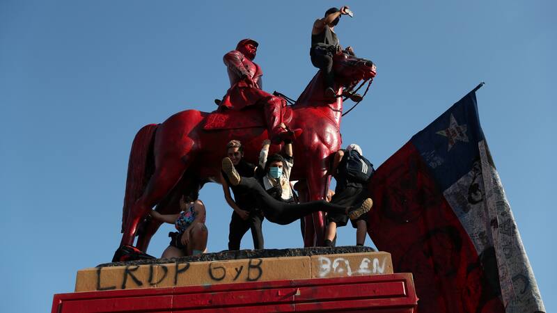 El pasado viernes un grupo de encapuchados que se manifestaban en Plaza Italia pintó completamente de rojo la estatua del General Baquedano que se emplaza en el lugar.