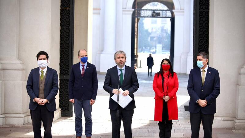 La vocería estuvo a cargo de los titulares de Interior, Gonzalo Blumel y Hacienda, Ignacio Briones, quienes estuvieron acompañados por la vocera Karla Rubilar, y los secretarios de Desarrollo Social, Cristián Monckeberg y de la Secretaría General de la Presidencia, Claudio Alvarado.