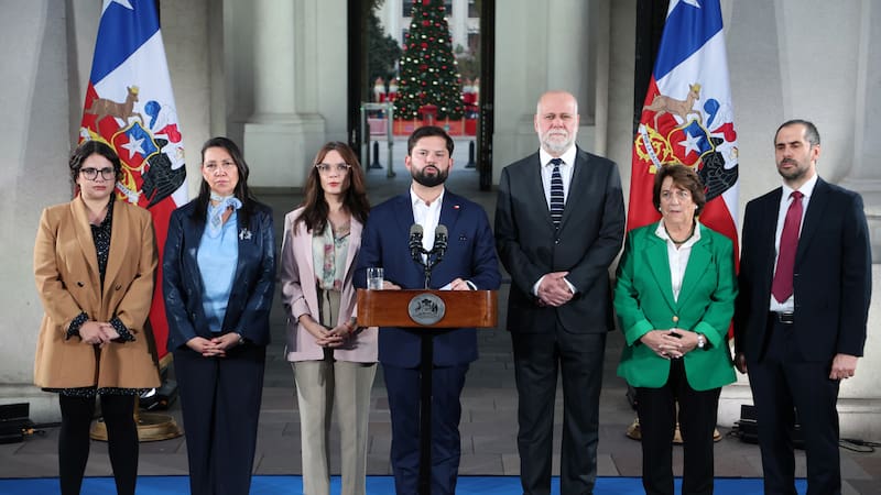 El Mandatario lo hizo flanqueado por los ministros del Interior, Álvaro Elizalde, de la Segegob, Camila Vallejo, de la Segpres, Macarena Lobos, de Defensa, Adriana Delpiano, de Hacienda, Nicolás Grau, y de la Mujer, Antonia Orellana.
