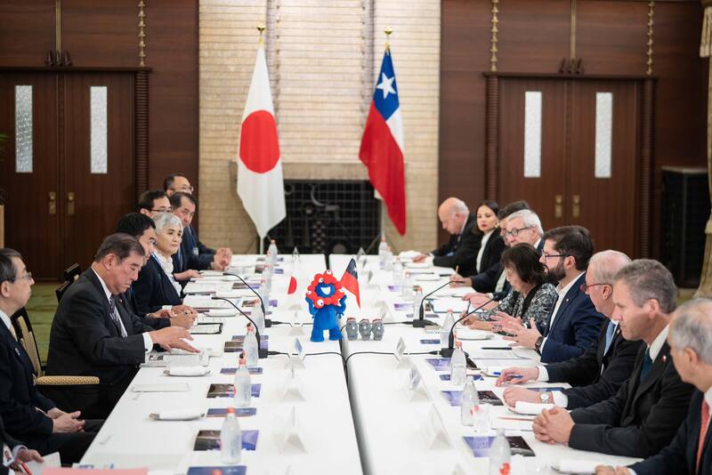 La principal actividad de Boric en Tokio fue la reunión ampliada que sostuvo junto a su delegación con el Primer Ministro japonés, Shigeru Ishiba, en su residencia oficial, quien también estuvo acompañado por una comitiva.