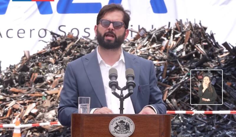 El Presidente Gabriel Boric encabezó este martes la destrucción de 25.015 armas incautadas en procedimientos policiales y por tribunales de justicia o entregadas voluntariamente, oportunidad en la que envió un duro mensaje contra el narcotráfico.