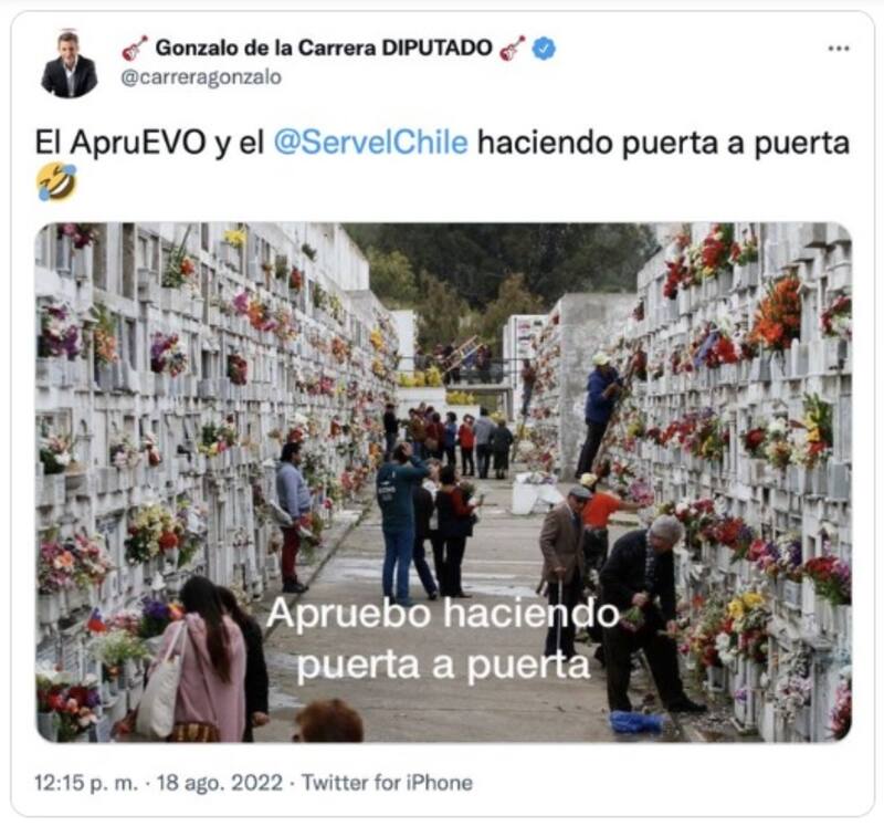En la red social, De la Carrera publicó esta jornada una imagen del Cementerio General lleno de visitantes, con la leyenda “El ApruEVO y el Servel haciendo puerta a puerta”. Esto, luego de que el martes pasado el diputado republicano cuestionara la aparición de personas fallecidas en el padrón electoral habilitado por el Servicio Electoral (Servel) para el plebiscito del 4 de septiembre.