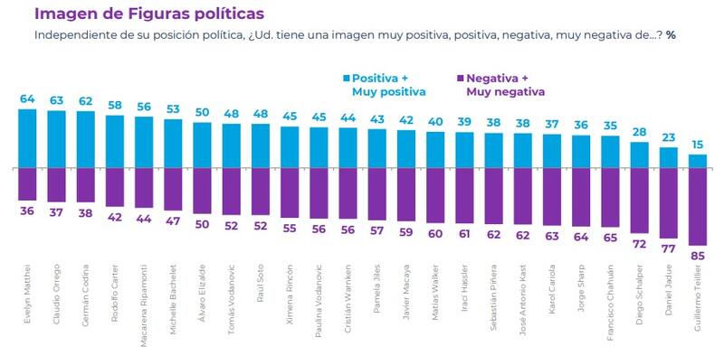 Finalmente, en cuanto a la imagen de figuras políticas la alcaldesa Evelyn Matthei (64%), el gobernador Claudio Orrego (63%) y el edil Germán Codina (62%) se posicionan como los mejor evaluados. En la vereda contraria, el diputado Diego Schalper (28%), el alcalde Daniel Jadue (23%) y el timonel del PC Guillermo Teillier (15%) son los peor evaluados.