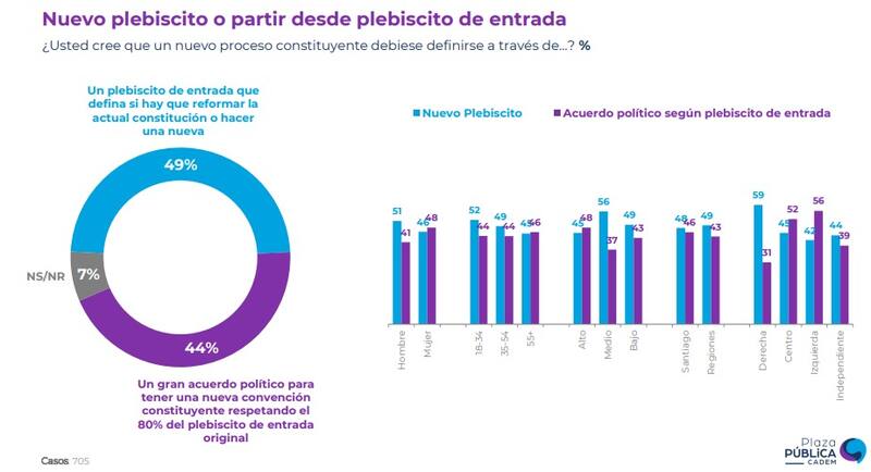 En este contexto, el 49% se inclinó para que el nuevo proceso constituyente debiese definirse a través de un plebiscito de entrada que indique si es que hay que reformar la actual Carta Magna o redactar una nueva, mientras que el 44% prefiere un gran acuerdo político para tener una nueva convención constituyente, respetando el 80% del plebiscito de entrada realizado el 25 de octubre 2020.