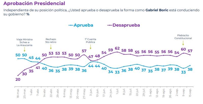La encuesta de opinión dio a conocer también que la aprobación a la gestión del Presidente Gabriel Boric aumentó 5 puntos porcentuales, subiendo de 33% (su registro más bajo desde que asumió) a 38%, mientras que su desaprobación evidenció una baja de 60% a 57%.