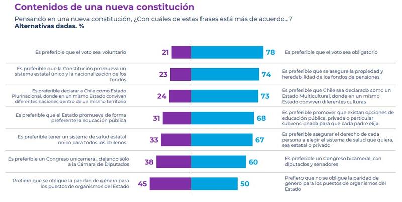 Por otra parte, y en relación con el debate sobre el fondo constitucional, el 78% prefiere que el voto sea obligatorio, el 74% está por asegurar la propiedad y heredabilidad de los fondos de pensiones, el 73% optó por la multiculturalidad por sobre la plurinacionalidad, 68% escogió la promoción y libertad de elección de todo tipo de educación, el 67% se inclinó por la libertad de elección en salud por sobre un sistema único, el 60% quiere un congreso bicameral y el 50% prefiere que no se obligue paridad de género para los cargos del sector público.