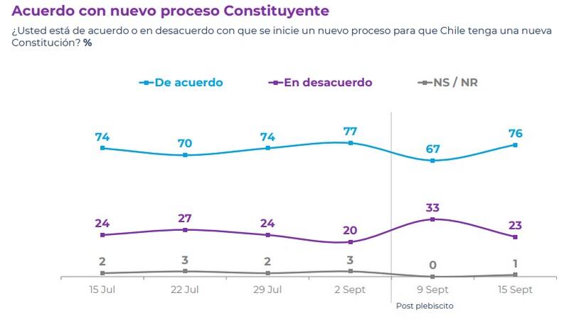 Este domingo se dieron a conocer los resultados de la encuesta Plaza Pública Cadem, correspondiente a la tercera semana de septiembre, los cuales revelaron que el 76% de los consultados está de acuerdo con que se inicie un nuevo proceso para que Chile tenga una nueva Constitución, un aumento de 9 puntos respecto a lo evidenciado la semana anterior post plebiscito.
