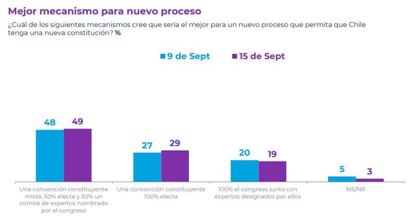 En torno a cuál sería el mejor mecanismo para un nuevo proceso constituyente, el 49% optó por una convención constituyente mixta, que sea mitad electa y mitad un comité de expertos nombrado por el Congreso, el 29% prefirió una convención constituyente totalmente electa y el 19% escogió que sea el Parlamento quien redacte el texto junto con expertos designados por los mismos legisladores.