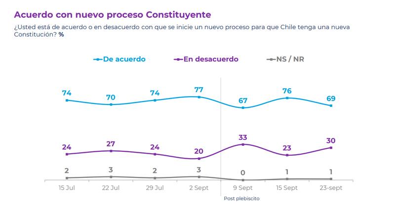 Este domingo se dieron a conocer los resultados de la encuesta Plaza Pública Cadem, correspondiente a la cuarta semana de septiembre, los cuales revelaron que el 69% de los consultados está de acuerdo con que se inicie un nuevo proceso para que Chile tenga una nueva Constitución, una disminución de 7 puntos respecto a lo evidenciado la semana anterior post plebiscito.