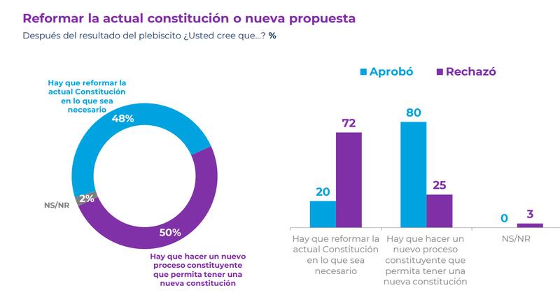Por otra parte, y sobre si sería prudente reformar la actual Constitución o tener una completamente nueva, el 48% de los encuestados afirmó que hay que hacerle cambios a la actual Carta Magna, mientras que un 50% optó por hacer un nuevo proceso constituyente que concluya con una nueva Constitución.