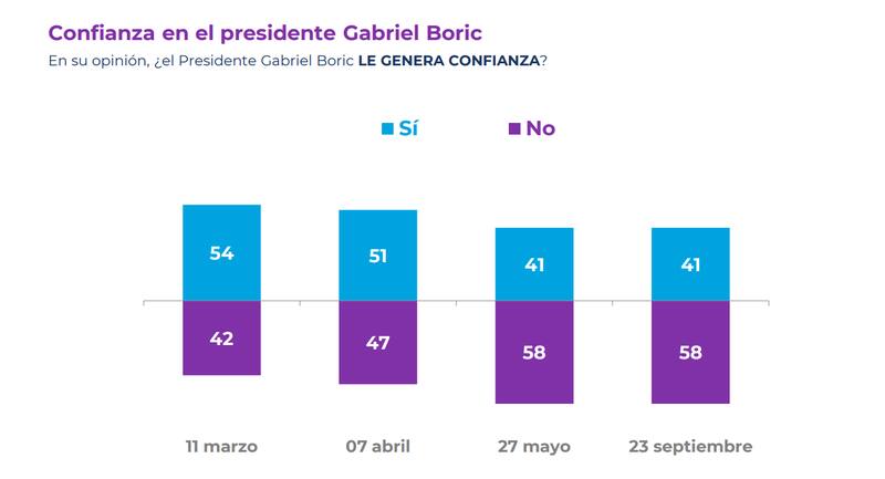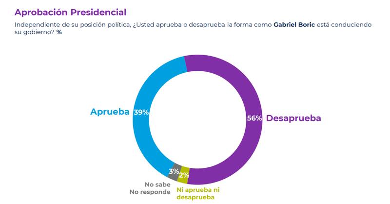 La encuesta de opinión dio a conocer también que la aprobación a la gestión del Presidente Gabriel Boric aumentó 1 punto porcentual, subiendo de 38% a 39%, mientras que su desaprobación evidenció una mínima baja de 57% a 56%.