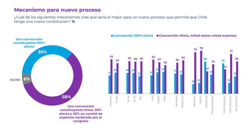 En torno a cuál sería el mejor mecanismo para un nuevo proceso constituyente, el 58% optó por una convención constituyente mixta, que sea mitad electa y mitad un comité de expertos nombrado por el Congreso, mientras que el 36% prefirió una convención constituyente totalmente electa.