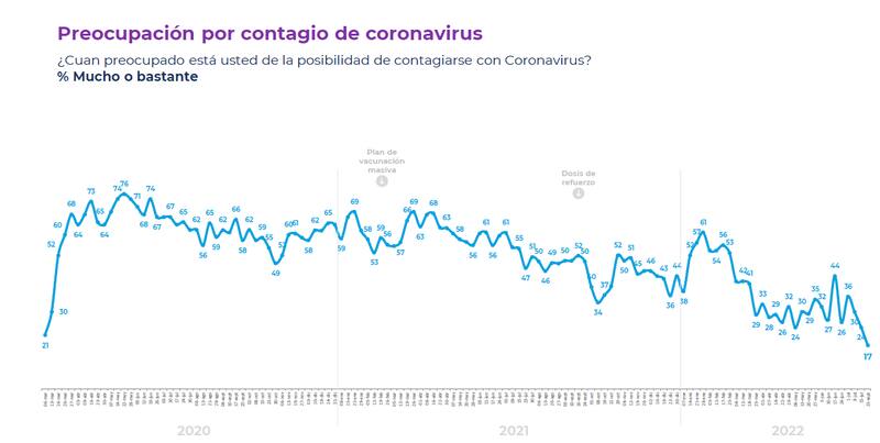 En relación a la preocupación de la ciudadanía de contagiarse de Covid-19, este ítem registró su mayor caída desde el año 2020 y sólo un 17% afirmó estar preocupado de contraer coronavirus.