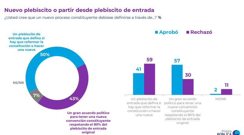 Asimismo, el 50% de los consultados se inclinó para que el nuevo proceso constituyente se defina a través de un plebiscito de entrada, mientras que el 43% prefiere un gran acuerdo político para tener una nueva convención constituyente, respetando el 80% del plebiscito de entrada realizado el 25 de octubre 2020.