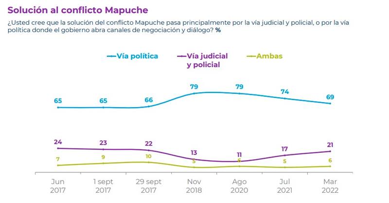 El sondeo reveló además que el 69% está de acuerdo con la vía política como una eventual solución al conflicto Mapuche, donde el gobierno abra canales de negociación y diálogo, mientras que el 21% sostiene que el problema se debe resolver por la vía judicial y policial. En el mismo contexto, un 56% está de acuerdo con que se extienda el Estado de Excepción en sectores de la Araucanía y el Biobío.