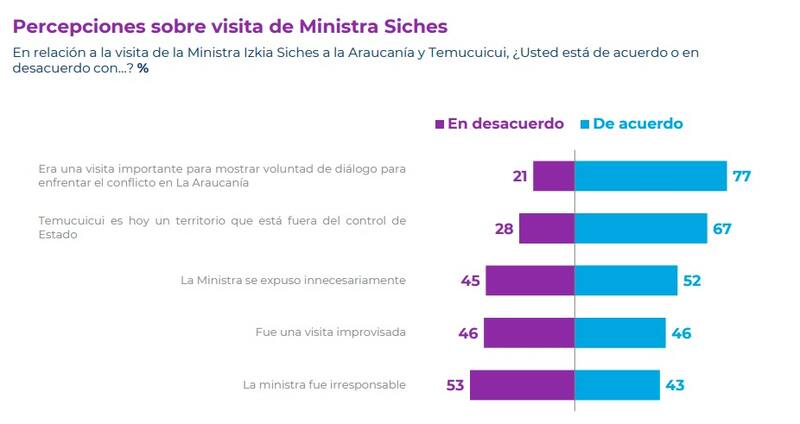 En el mismo sondeo, un 67% está de acuerdo con que Temucuicui es actualmente un territorio que está fuera de control, mientras que un 52% cree la secretaria de Estado se expuso innecesariamente. En tanto, un 46%, simultáneamente, está de acuerdo y en desacuerdo con que la visita fue improvisada, y por último un 53% está en desacuerdo en que la actitud de la ministra fue irresponsable.