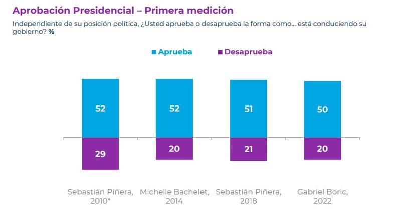 En otro aspecto, se detalló que el Presidente Gabriel Boric debutó con un 50% de aprobación, con mínimas diferencias con las primeras semanas de los exmandatarios Sebastián Piñera en 2010 (52%), Bachelet en 2014 (52%) y Piñera en 2018 (51%)