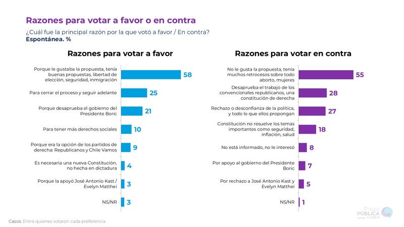 Entre las razones esgrimidas para votar por la opción que resultó ganadora, se encuentran los retrocesos que el texto constitucional podía representar en temas de aborto y mujeres (55%). La segunda razón más aludida fue la desaprobación hacia el trabajo de los convencionales republicanos -que tenían mayoría y en el Consejo- y por considerar que se trataba de una Constitución de derecha (28%).