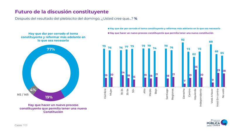 Este domingo, se conocieron los resultados de la encuesta Plaza Pública que realiza Cadem, correspondiente a la tercera semana de diciembre. Los resultados arrojaron que un 77% de los encuestados cree que hay que dar por cerrado el tema constituyente, después de los resultados del plebiscito del 17-D, instancia en la que ganó la opción “En contra”. Un 19%, en tanto, respondió que se debe hacer un nuevo proceso constitucional.