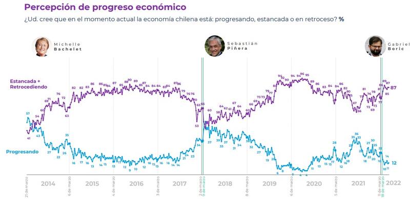 Una estadística que llama la atención en la encuesta Cadem de esta semana es que el 87% de los consultados cree que en la actualidad la economía chilena está estancada o en retroceso, tendencia que supera el 80% desde que asumió el actual jefe de Estado. En contraposición a ello, sólo el 12% piensa que la economía está progresando.