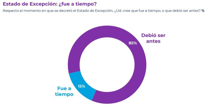 En el mismo contexto, el 85% cree que el decreto de estado de excepción debió haber sido antes, respecto a un 15% que consideró que la medida se realizó a tiempo.