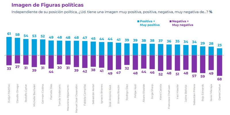 En otro punto, Evelyn Matthei se alza como la figura política mejor evaluada, con un 61%, y le siguen Claudio Orrego (58%), Rodolfo Carter (54%) y la expresidenta Michelle Bachelet (53%). En la vereda contraria, el alcalde de Recoleta, Daniel Jadue el personaje con más baja aprobación, con un 23%. A él le siguen Javier Macaya (28%), Rojo Edwards (29%) y el exmandatario Sebastián Piñera (34%).