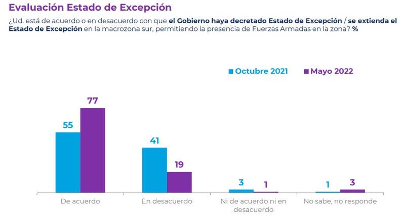 Este domingo se conocieron los resultados de la encuesta Plaza Pública Cadem, correspondiente a la tercera semana del mes de mayo, la cual dio a conocer que el 77% de las personas encuestadas valida que el Presidente Gabriel Boric haya decretado estado de excepción en la Macrozona Sur, permitiendo la presencia de Fuerzas Armadas en la zona. Por otra parte, el 19% se manifestó en desacuerdo a esta medida.