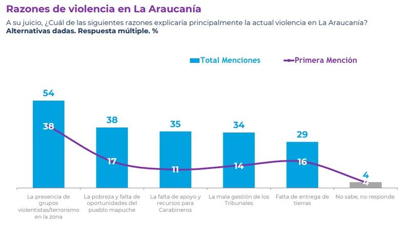 Asimismo, en torno a cuáles serían las razones que explicarían principalmente la actual violencia en dicho territorio, el 54% se inclinó por la presencia de grupos violentistas en la zona, el 38% por la pobreza y la falta de oportunidades del pueblo mapuche, el 35% por la falta de apoyo y recursos para Carabineros, el 34% por la mala gestión de los tribunales y el 29% por la falta de entrega de tierras.