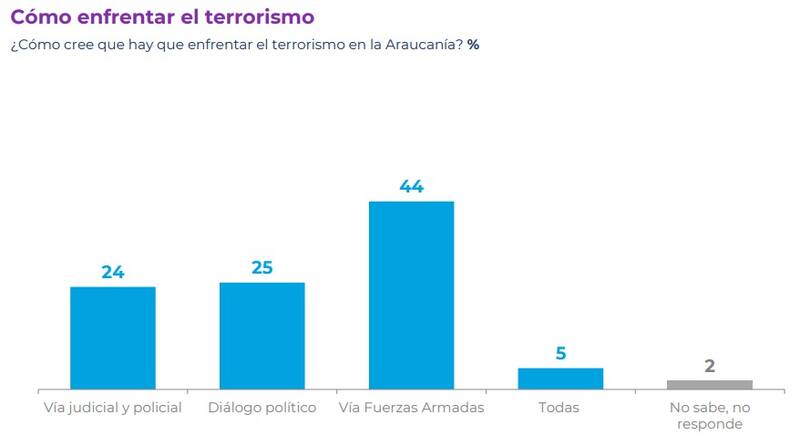 Por su parte, el 76% piensa que en la Región de La Araucanía hay terrorismo, mientras que el 19% desestima esta afirmación, y el 5% no sabe. Al respecto, el 44% cree que el terrorismo hay que enfrentarlo vía Fuerzas Armadas versus el 25% que prefiere la opción del diálogo político y el 24% que está por la vía judicial y policial.