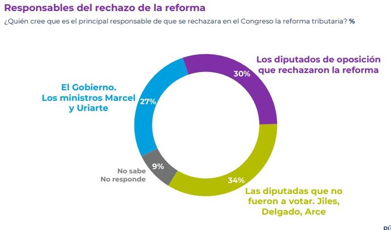 Además, el sondeo de opinión dio a conocer que un 82% está de acuerdo con que Chile necesita una nueva reforma tributaria, mientras que un 34% atribuye que las principales responsables del rechazo del proyecto fueron las diputadas Jiles, Delgado y Arce, que se ausentaron de la votación.