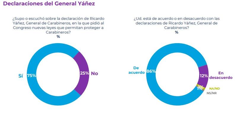 En torno a las declaraciones, la encuesta Plaza Pública, que realiza Cadem, dio a conocer este domingo que un 86% de los encuestados se mostró de acuerdo con los dichos emitidos por la máxima autoridad de Carabineros.