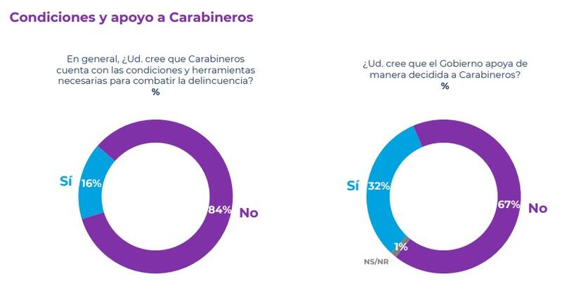 En tanto, un 84% considera que la institución policial no cuenta con las condiciones y herramientas necesarias para combatir la delincuencia. Además, un 67% piensa que el Ejecutivo no apoya de manera decidida a Carabineros.