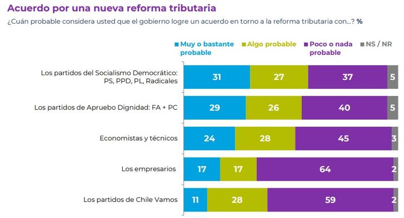 En tanto, un 64% de la muestra encuestada considera que es poco o nada probable que el gobierno logre un acuerdo en torno a la reforma tributaria con los empresarios, y un 59% cree que el Ejecutivo no llegará a acuerdo con los partidos de oposición.