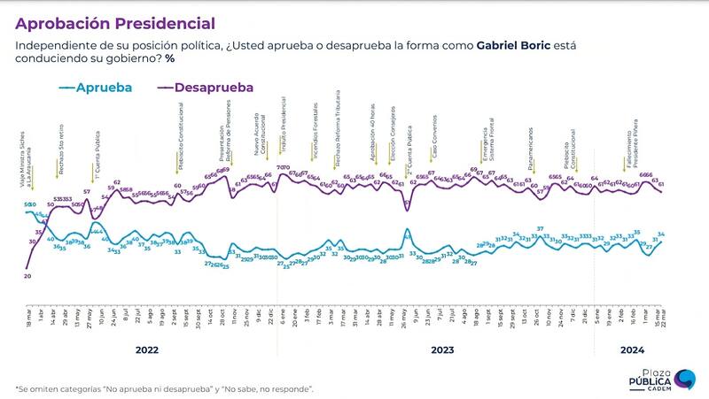 Cadem: aprobación a Presidente Boric aumenta a un 34%