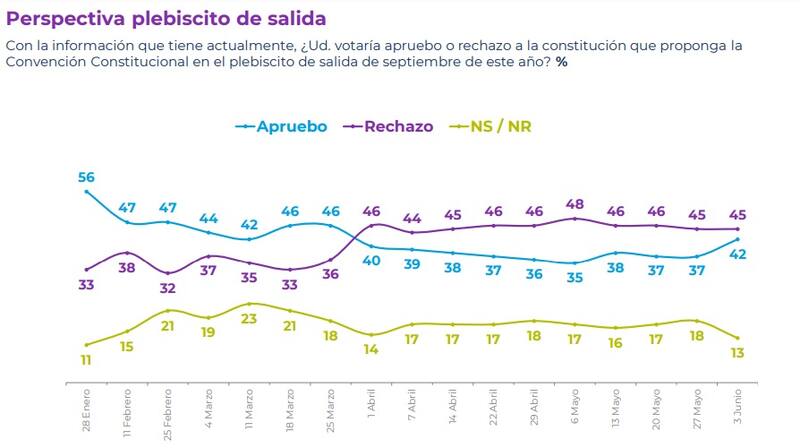 El sondeo de opinión correspondiente a la primera semana de junio reveló además que el 50% de los consultados cree que en el plebiscito del próximo 4 de septiembre se aprobará la nueva Constitución, por sobre el 37%, que piensa que ganará la opción Rechazo.