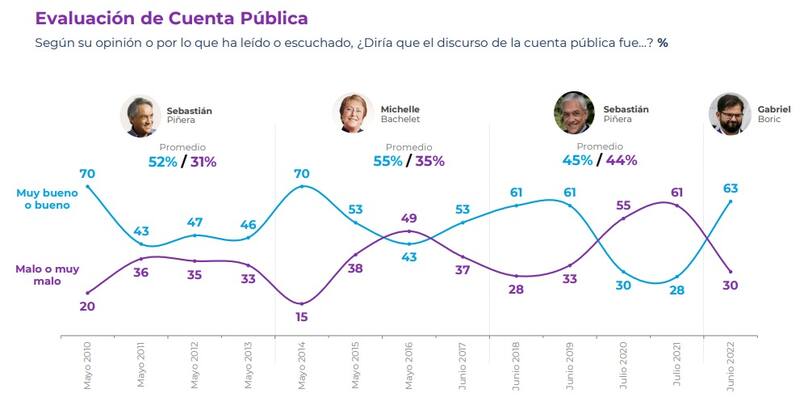 En el mismo contexto, el sondeo dio a conocer que el 68% de las personas consultadas vio o se informó del discurso del mandatario, lo que representa la visibilidad más alta de una cuenta pública desde que cambiara de formato, mientras que el 63% lo evaluó cómo bueno o muy bueno, posicionándose como la mejor evaluación desde mayo de 2014.